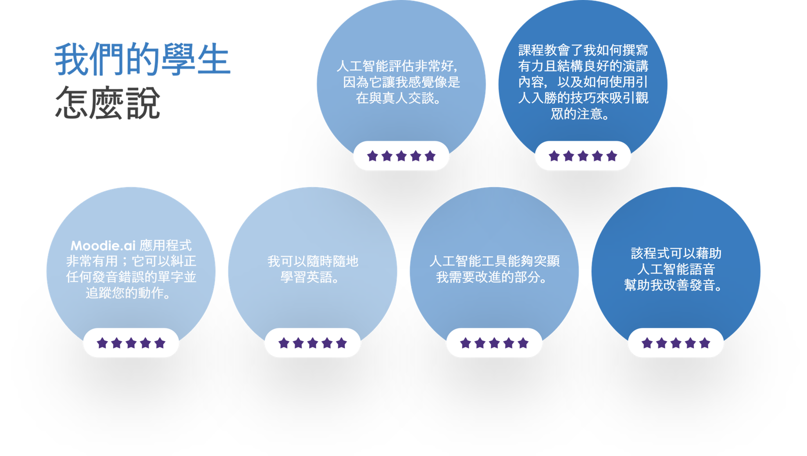 有了 Moodie.ai 的陪伴,學生可以反覆練習,並透過具體的回饋,即使在沒有真人教師指導和支援學生的情況下,學生也能夠繼續練習並看到即時進步。